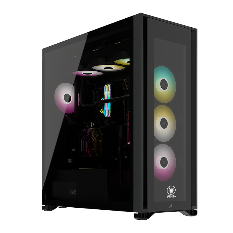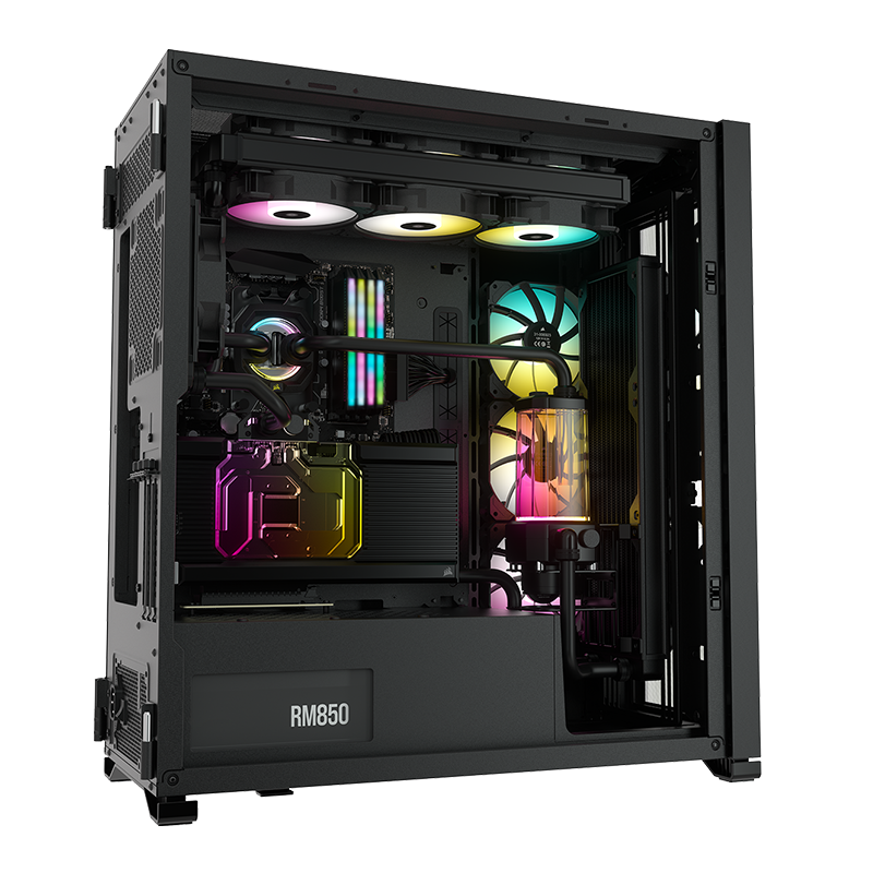 Multiple RGB cooling fans for airflow and style A liquid cooling system with visible tubes and a reservoir High-performance components such as RGB RAM sticks and a modern graphics card A Corsair RM850 power supply unit Sleek black chassis with tempered glass side panel to showcase the internal components It’s designed for gaming, high-end performance tasks, or professional creative work, combining power, cooling efficiency, and aesthetics.