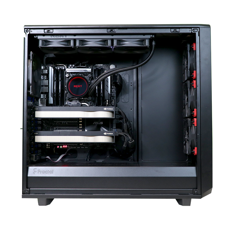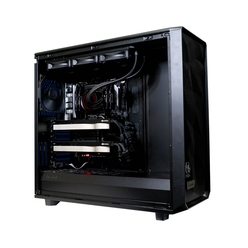 This is a high-performance workstation and gaming PC built inside a sleek, modern black chassis. The system includes: Dual NVIDIA graphics cards (SLI/dual-GPU setup) for extreme graphical power Liquid cooling system mounted at the top for efficient temperature control A clean internal layout with optimized cable management High-speed RAM and a robust ASUS motherboard for […]