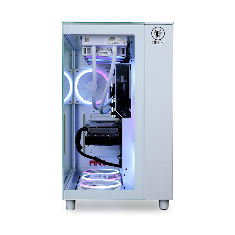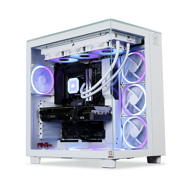 This elegant custom-built PC blends powerful performance with a stunning white aesthetic. Featuring a fully white chassis with tempered glass panels, it is illuminated by vibrant RGB fans and liquid cooling, giving it a futuristic glow.