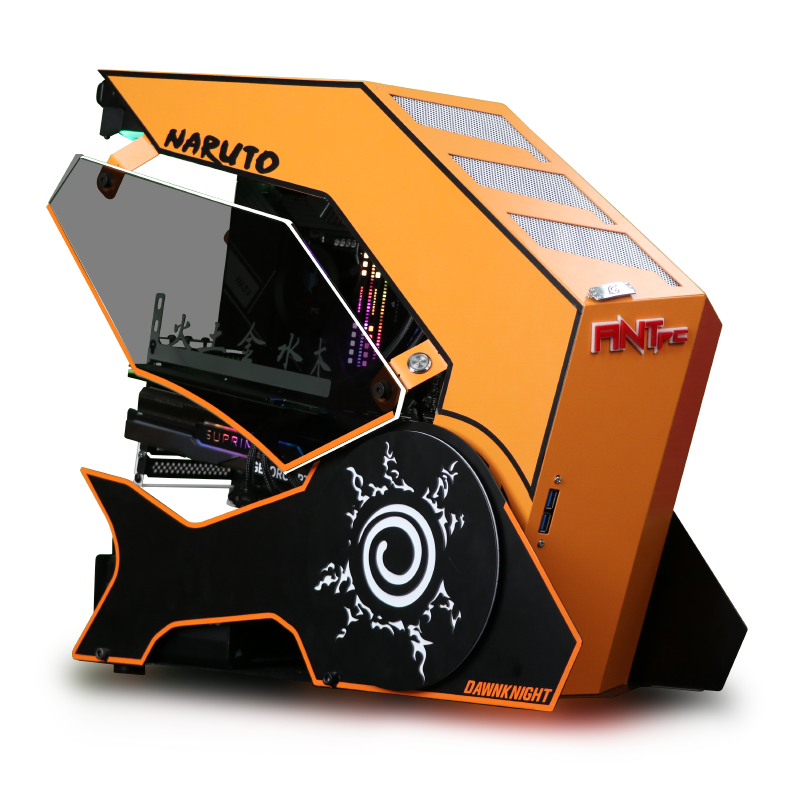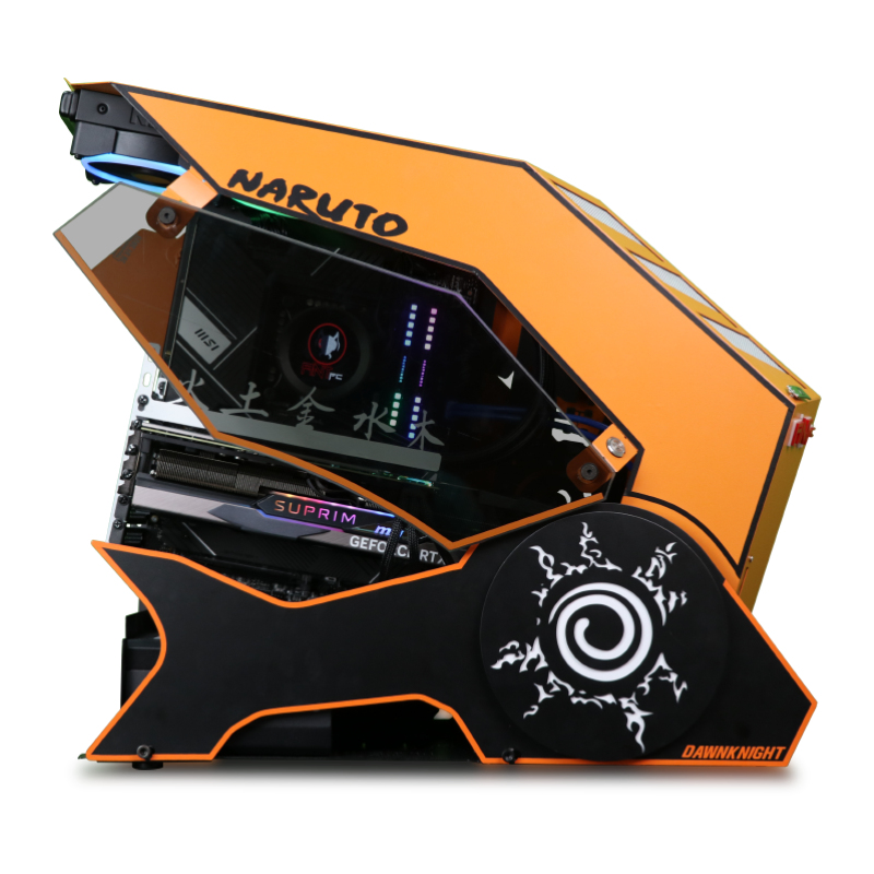 This one-of-a-kind custom PC is built for both hardcore gamers and anime enthusiasts. Inspired by the legendary Naruto series, the case design features a striking orange-and-black theme with the iconic Hidden Leaf Village swirl symbol.